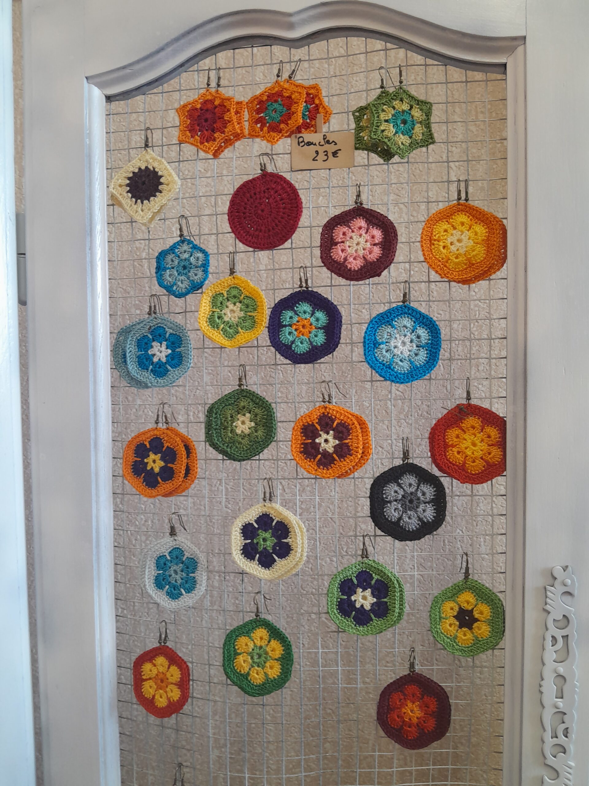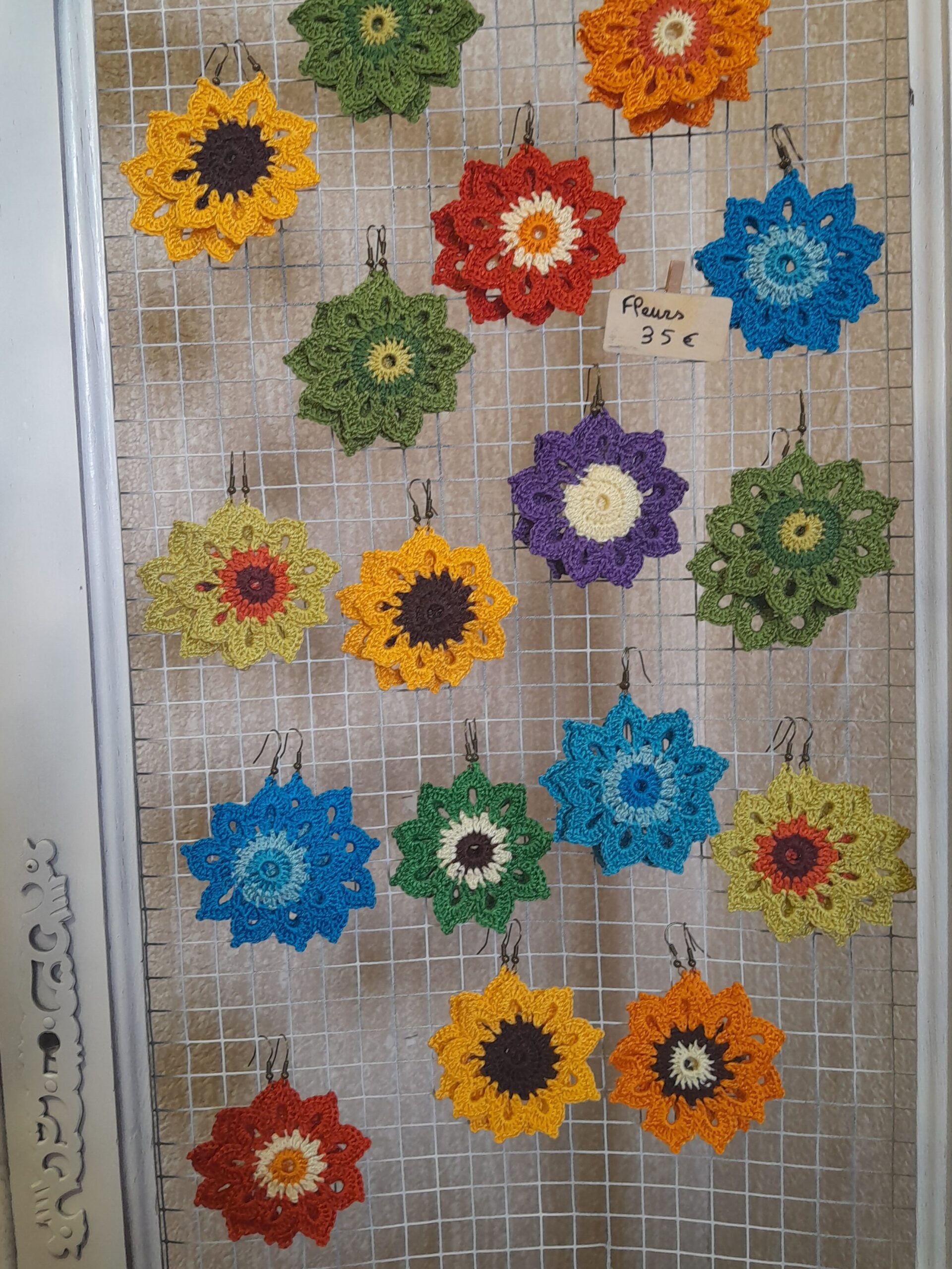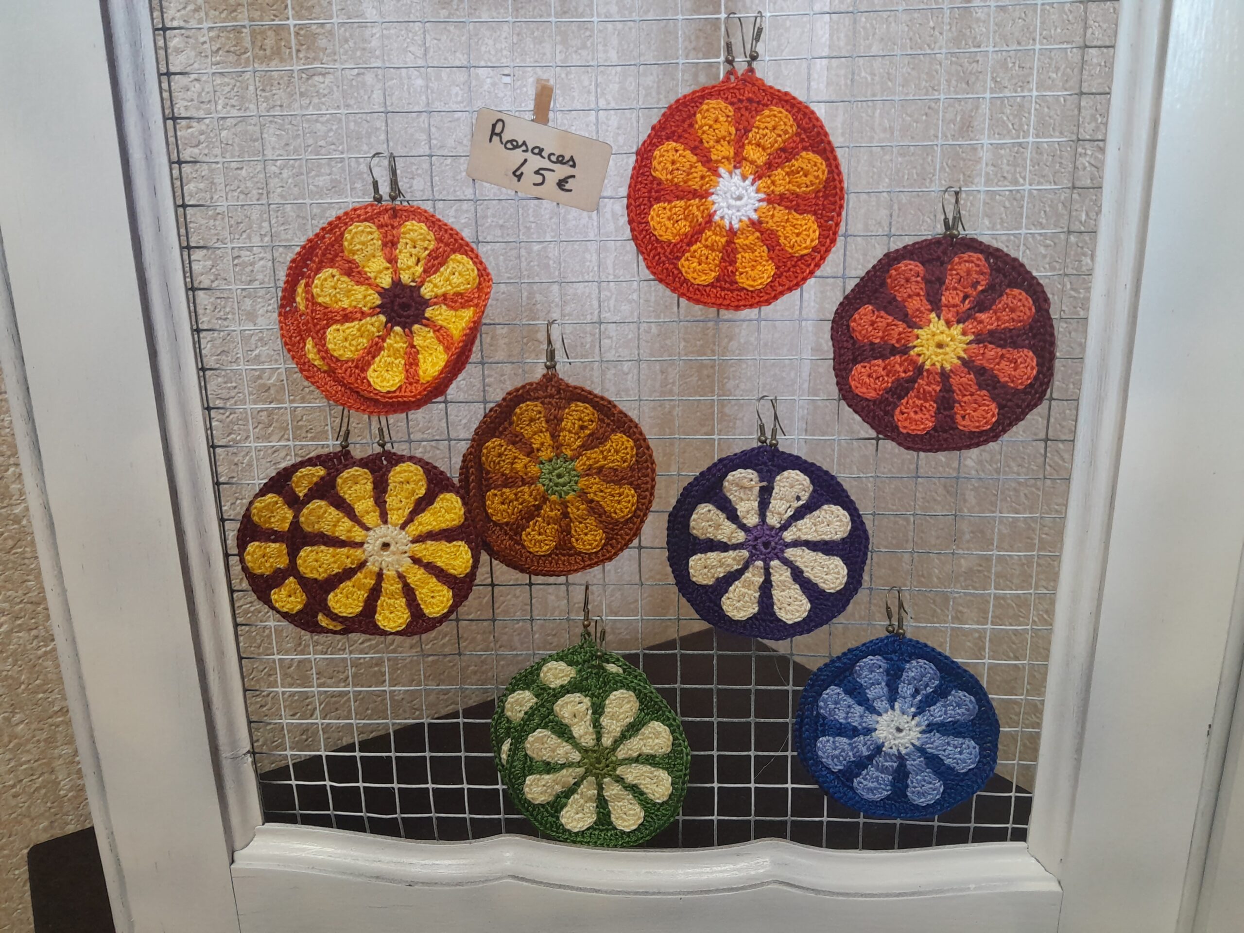 Les boucles d’oreilles sont fabriquées avec du coton à broder 1,5mm et des boucles sen fer ou acier inoxydable.
